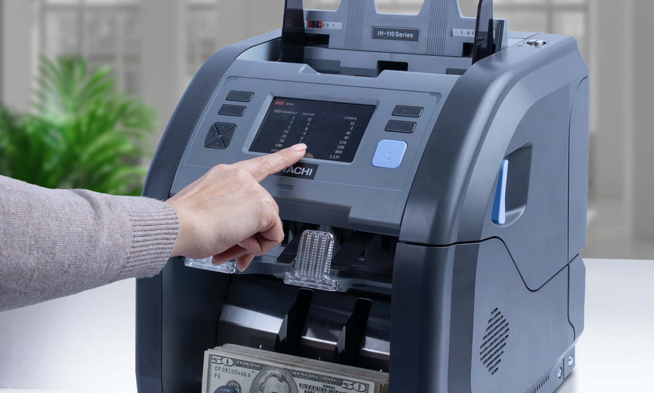 Получается, что просто посчитать деньги уже недостаточно: в момент приема наличные нужно проверить, отсортировать, зафиксировать результат и к тому же проделать все эти операции с максимальным комфортом для покупателя. Для таких случаев и разработали двухкарманный счетчик-сортировщик Hitachi iH-110.