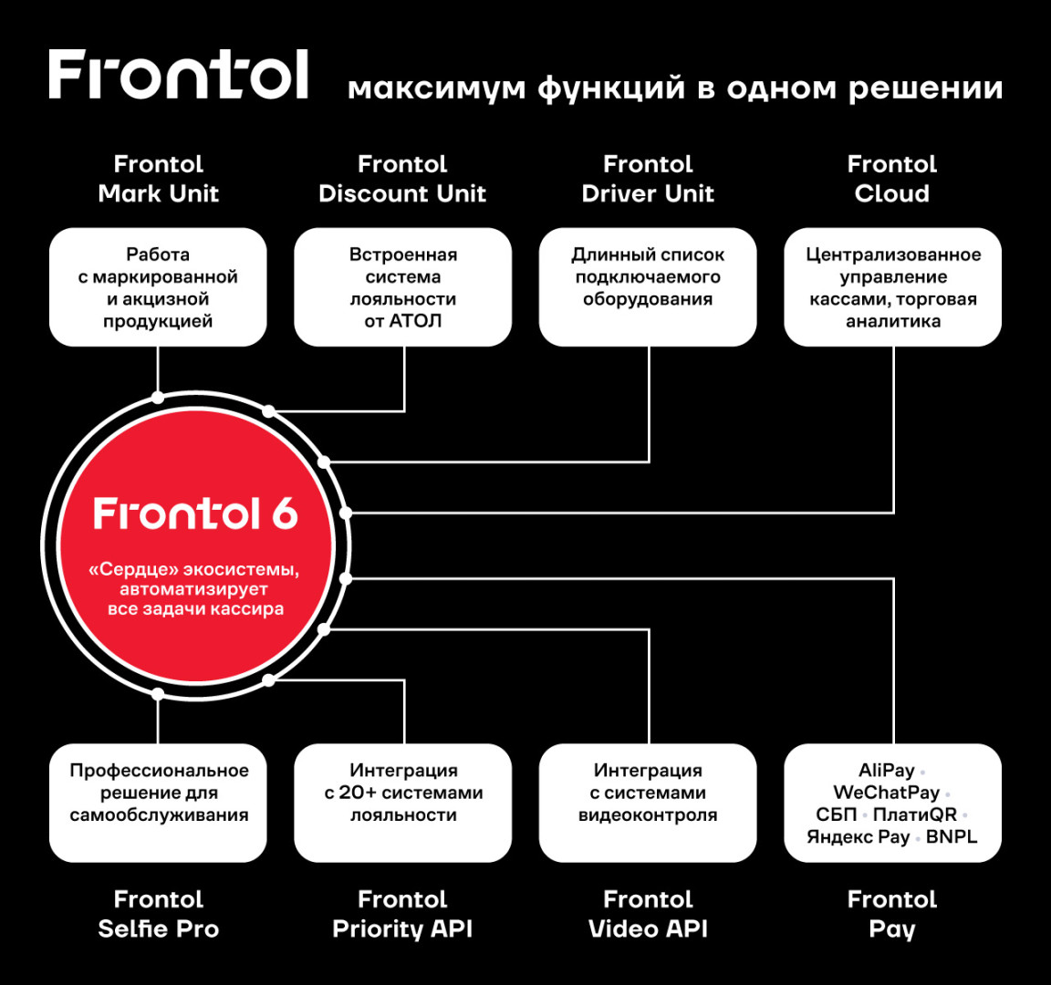 - Гибкая конфигурация под бизнес‑процессы. Frontol позволяет адаптировать функционал под уникальные потребности ритейла, HoReCa и сервисных сетей.