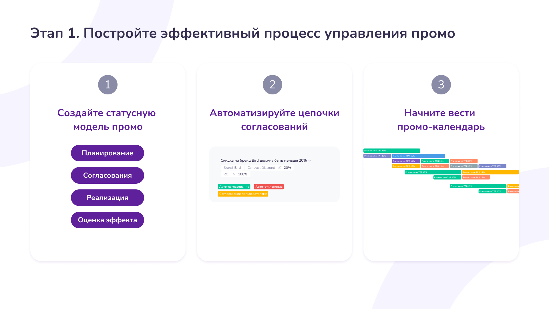 Автоматизация цепочек согласований. Во многих компаниях существуют промоправила или гайдлайны, – например, запрет на предоставление скидки более 20% на определенный артикул. Автоматизация этих процессов позволяет существенно сэкономить время организации при создании промоакций.