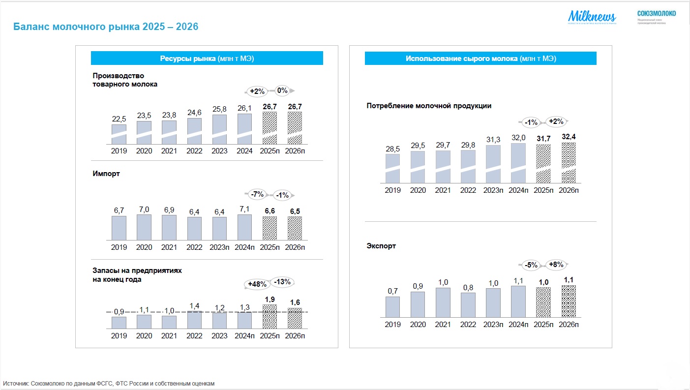 Эксперты считают, что 2026-й будет для молочников непростым годом и пройдет в поиске баланса. По прогнозу Союзмолока, в 2026 году потребление молока вырастет до 32,4 млн т и приблизится к уровню 2024 года (32,0 млн т). Ожидается, что цены на продукцию будут стабилизироваться, и прироста производства сырого молока скорее всего не произойдет (и тогда получится снизить существенные товарные запасы на предприятиях). Пока в отрасли не заметили сильного снижения инвестиционной активности, и эксперты полагают, что игроки инвестируют в развитие собственные средства. Однако целесообразность наращивания производств, к чему призывает министерство, под вопросом.