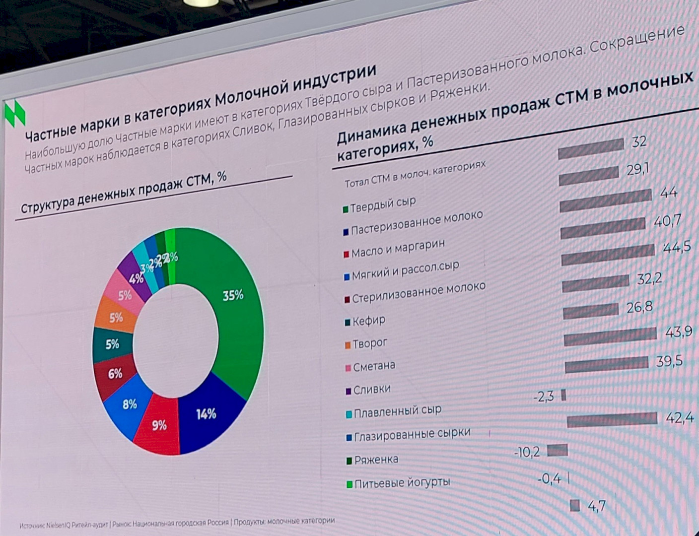 Продажи товаров под частными марками ритейлеров растут стремительно. В молочной продукции прирост продаж СТМ составляет 32% в деньгах. Наибольшую долю частные марки имеют в категориях твердого сыра (35%) и пастеризованного молока (14%). Сокращение доли частных марок наблюдается в категориях сливок, глазированных сырков и ряженки.