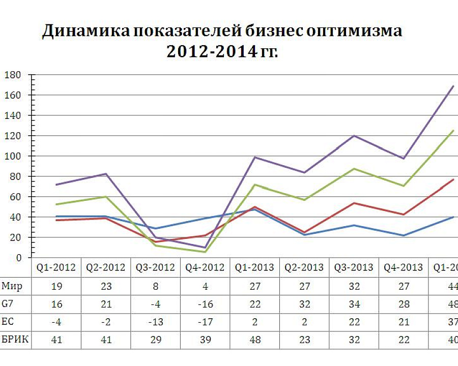 Бизнес оптимизм и индикаторы роста в странах G7 значительно возросли за последние 12 месяцев. Бизнес оптимизм предпринимателей в странах БРИК вернулся на уровень четвертого квартала 2012 года и в целом сохраняет стабильное положение.