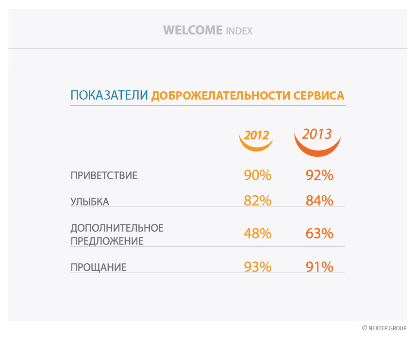Приветствие и прощание уже отработанный элемент – девять из десяти клиентов могут ощутить это на себе. Если Вы десятый, то Вам просто повезло меньше, чем всем остальным. Отметим, что результаты 2013-го года сопоставимы с оценками предыдущего.Медленно, но верно растет количество встречающих улыбок: по сравнению с 2012-м их стало больше на 2%. Это, конечно, меньше, чем приветствий (84%), но главное – удержать положительную тенденцию в 2014 году.