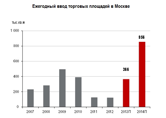 Татьяна Ключинская поясняет: «После активных 2009-2010 годов, когда в столице активно вводились объекты, строительство которых было начато до кризиса, на рынке наблюдалось относительное затишье. Рекордным для Москвы станет 2014 год, на который намечен ввод таких масштабных объектов, как ТРЦ «Авиа Парк», Vegas Сити и Vegas Кунцево, «Колумбус». В результате общий объем нового предложения в городе может достигнуть 856 тыс. кв. м, а общий объем торговых площадей – немногим менее 4,5 млн кв. м».
