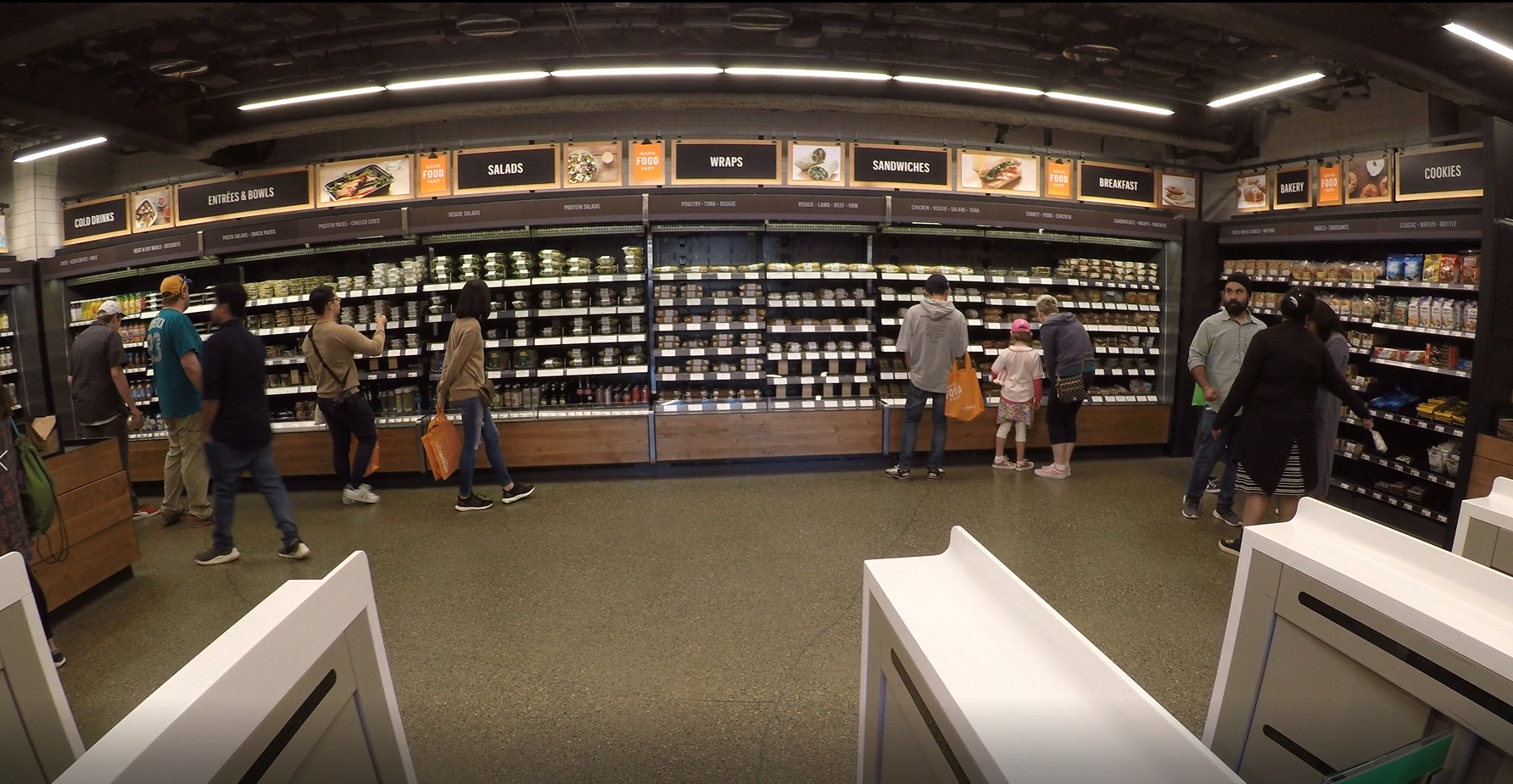 Так как средняя площадь Amazon Go варьируется от 110 до 220 кв. м, ассортимент магазина довольно невелик. Наиболее популярный уголок «беспилотника» — это отдел с готовыми завтраками, обедами и ужинами.