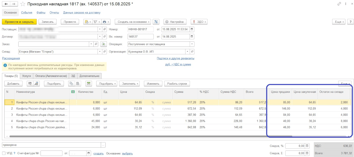 Поэтому программисты «Метода» добавили дополнительную информацию на формы ввода приходных накладных. Теперь вся необходимая информация для принятия решения о переоценке товара «перед глазами»: