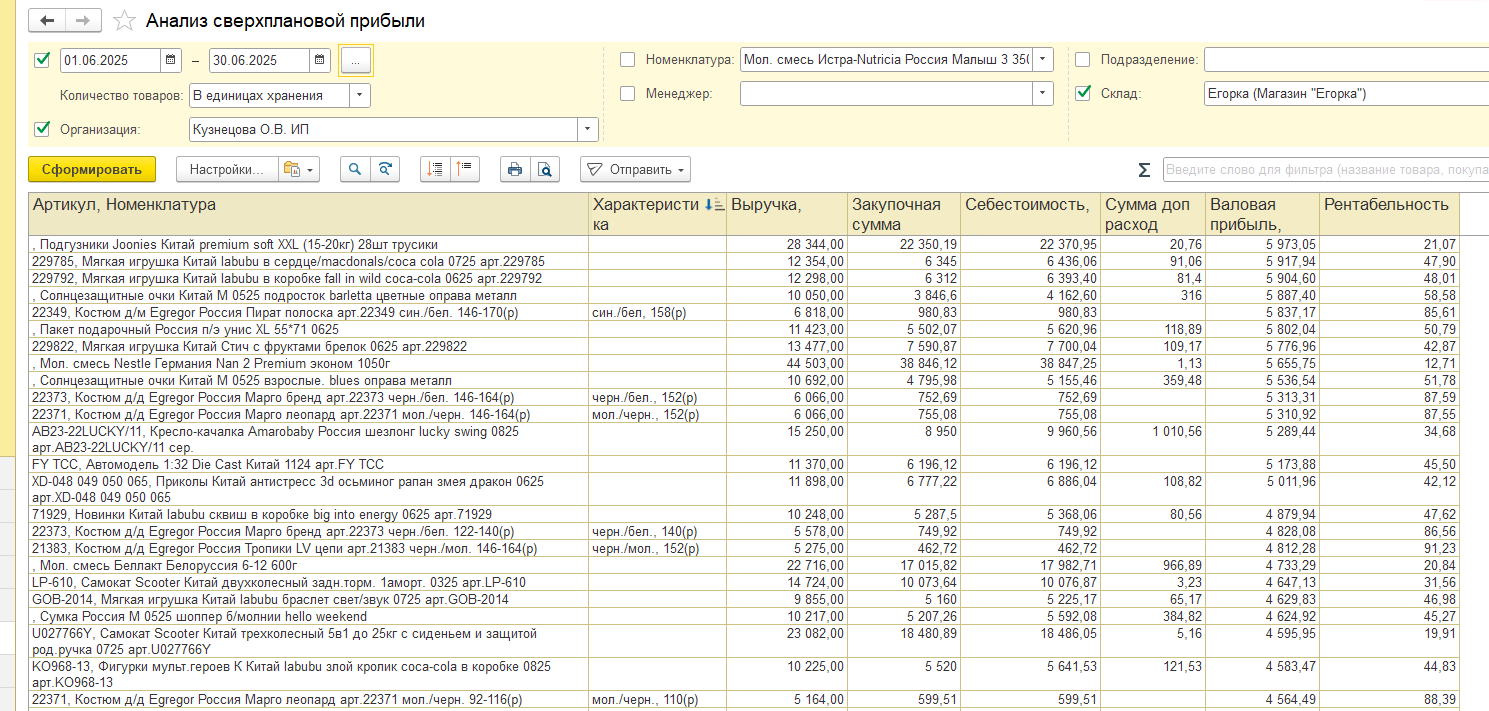 «Анализ сверхплановой прибыли» выявляет причины дохода или убытка от каждой конкретной продажи. Он представляет собой расширенную версию стандартного отчета «Валовая прибыль», но также показывает совокупные затраты, влияющие на себестоимость товаров.