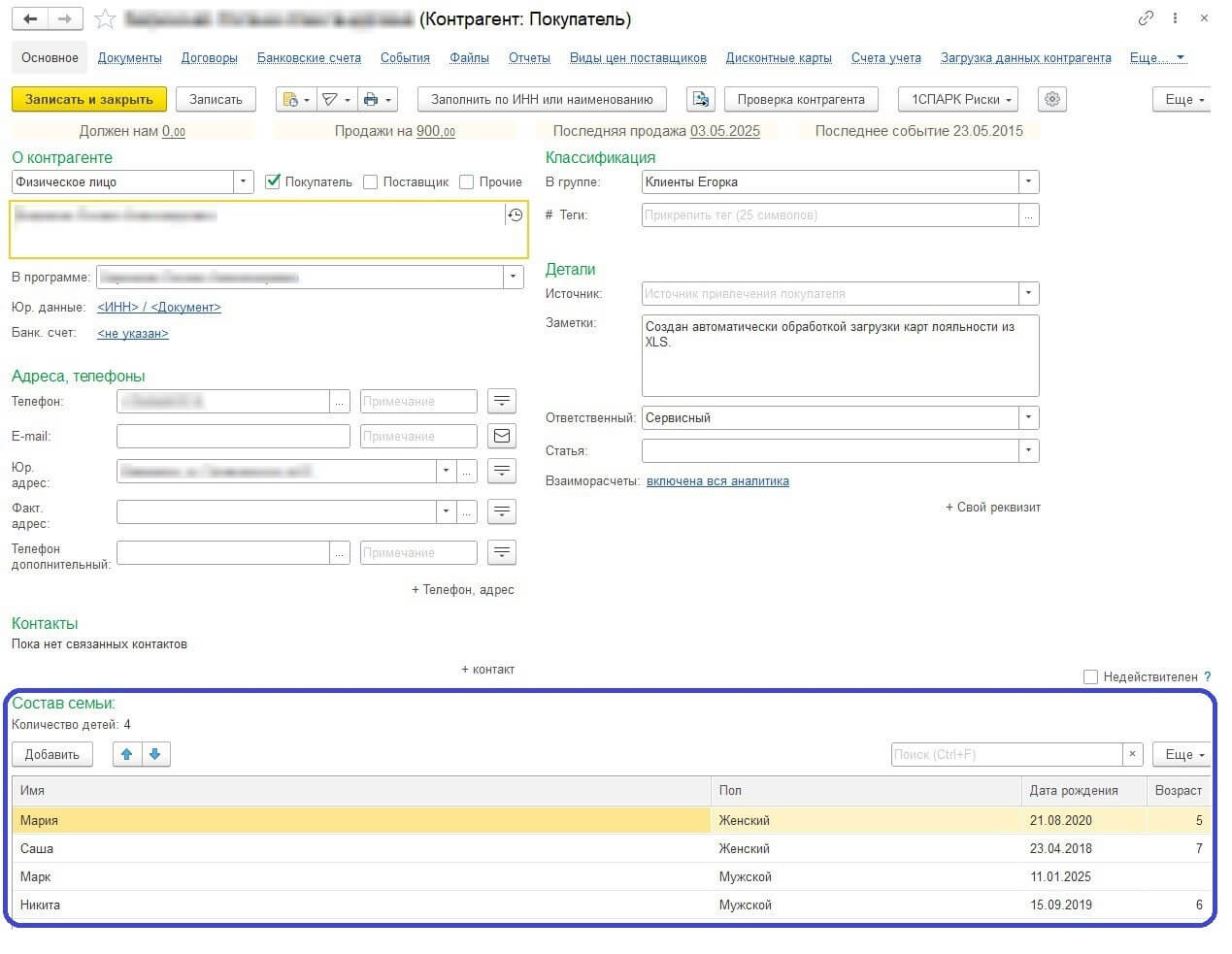 Магазину «Егорка» требовалась разработка универсальной системы лояльности. Для этого в «1С:УНФ» нужно было занести сведения о детях покупателей с датами их рождения. Это важно для маркетинга и снабжения: команда делала персональные предложения покупателям, предлагала индивидуальные скидки и точнее планировала ассортиментную матрицу.