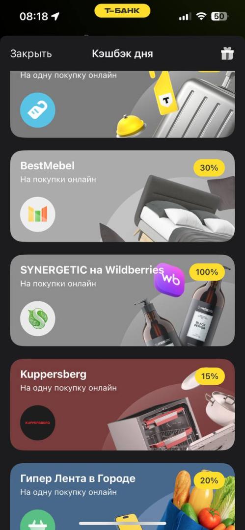 - «Кешбэк дня» – размещение в приложении Т-Банка, которое подсвечивало предложение Synergetic для всей аудитории банка.