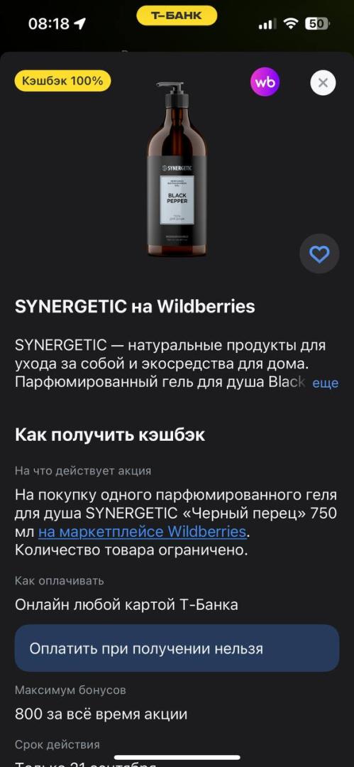 Главным инструментом стал digital sampling – цифровой аналог традиционного семплинга в офлайн-ритейле. Пользователи приложения Т-Банка видели предложение от Synergetic, в один клик переходили на карточку акционного товара на Wildberries и получали 100% кешбэк после его приобретения на площадке. Кешбэк предоставлялся в рамках механики, где бренд и финтех медиа совместно стимулируют пользователя совершить первую покупку. Он оплачивает товар на Wildberries по полной цене, а возврат получает через акционную программу.