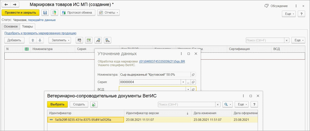 Сканируем марки, которые нанесли на продукцию, выбираем присвоенную ВСД и серию.