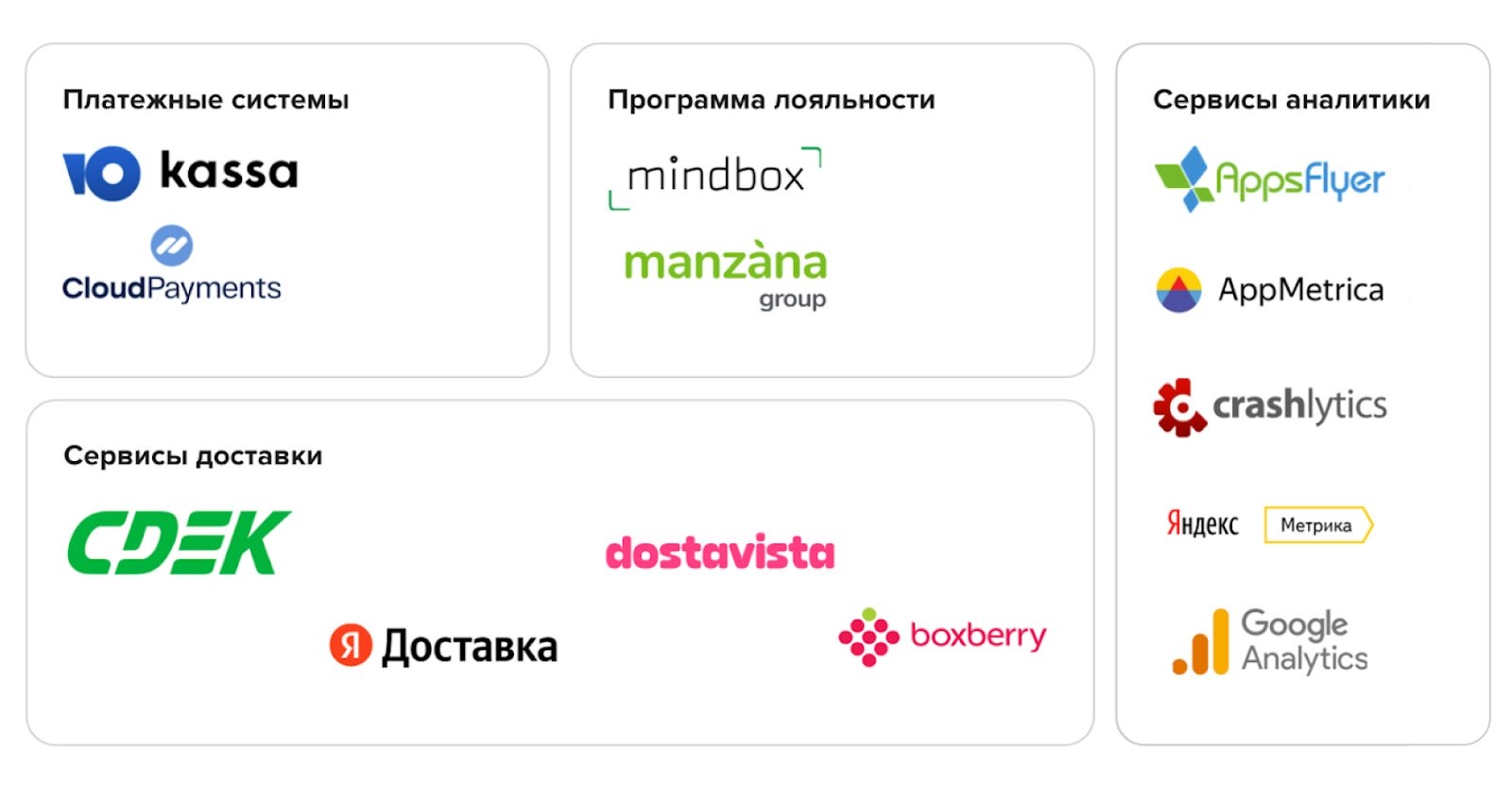 Например, по умолчанию в готовом приложении Flex.shop есть интеграции с «1С», «Яндекс Доставкой», Manzana, CloudPayments и другими сервисами.