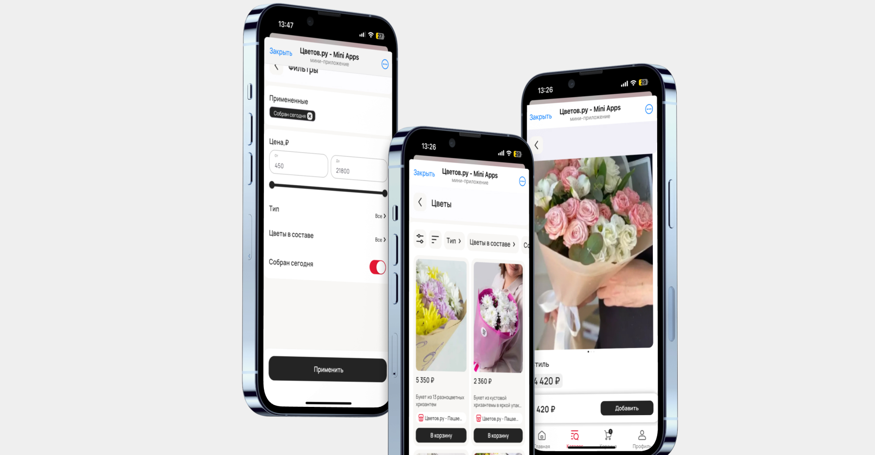 Другой вариант дистрибуции через Telegram — Telegram Mini Apps. По сути это приложение внутри мессенджера. Например, в мини-приложении «Цветов.ру» есть: