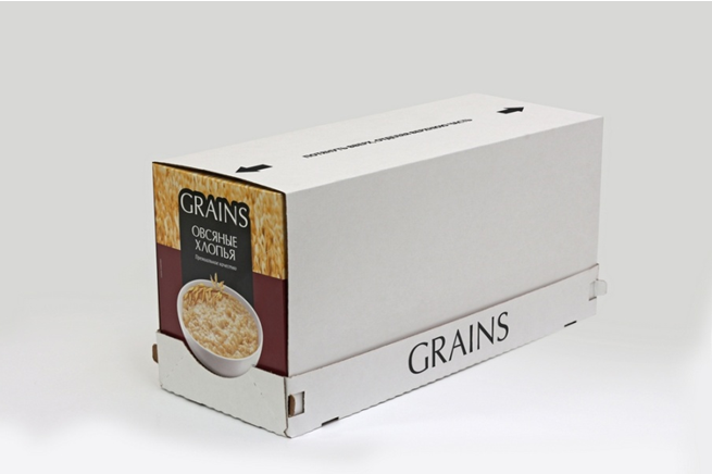 Это шоу-бокс для продажи бакалейных продуктов (пакетированных каш, супов, специй и т.п.). Конструкция шоу-бокса делает транспортировку продукции удобной и безопасной и одновременно способствует повышению привлекательности товара для покупателей в местах продаж. Кроме этого, благодаря нанесенным перфорациям, при поступлении в торговую сеть, упаковка превращается в дисплей, позволяющий быстро выставлять продукцию на полку в два яруса.