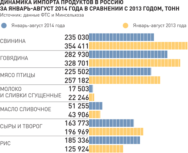 Если говорить о цифрах, то оценка объема импорта продовольствия в Россию – порядка 45 миллиардов долларов США в год. В том числе, например, Украина поставляла продукцию на 2 миллиарда долларов США – эта сумма может снизиться наполовину. Поставки продукции из Украины будем в основном замещать продукцией Белоруссии и ростом производства в самой России. Поставки из Евросоюза оценивались в 15, 2 миллиарда долларов США в год. По прогнозам, объем импортных поставок снизится на 5 миллиардов долларов США.