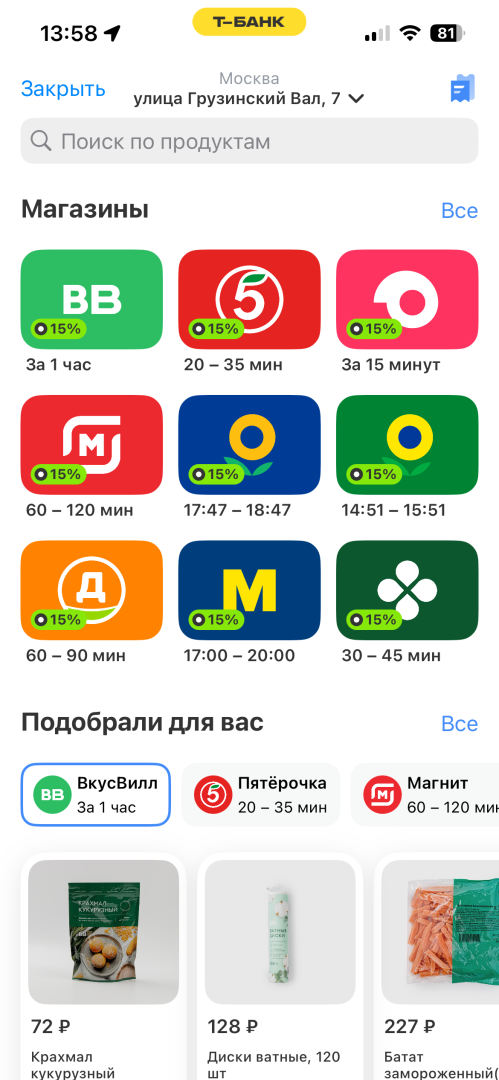 Клиенту удобно покупать привычные продукты и товары разных сетей в одном приложении Т-Банка буквально в один клик, при этом получать повышенный кешбэк и возможность оплаты в рассрочку.