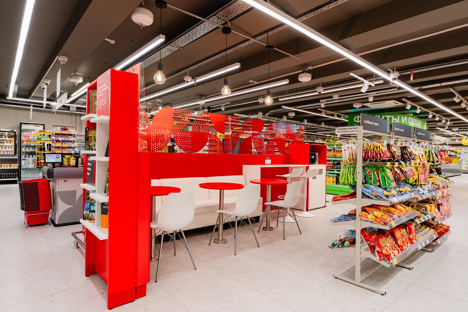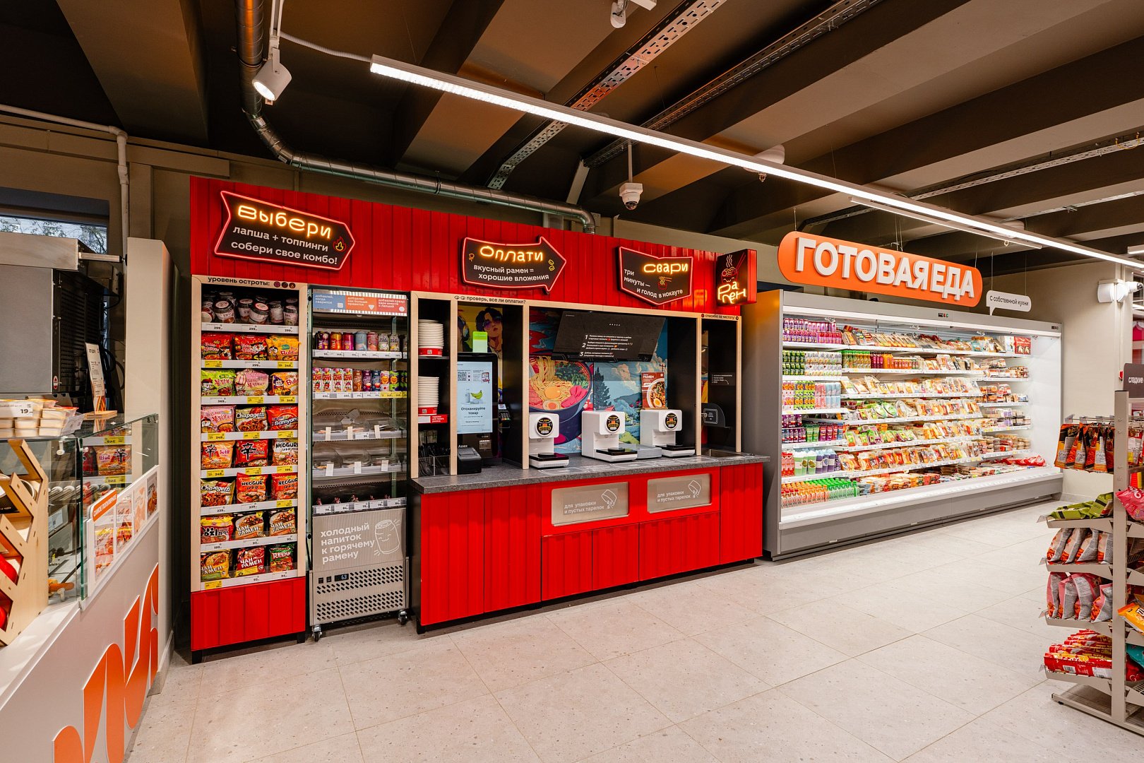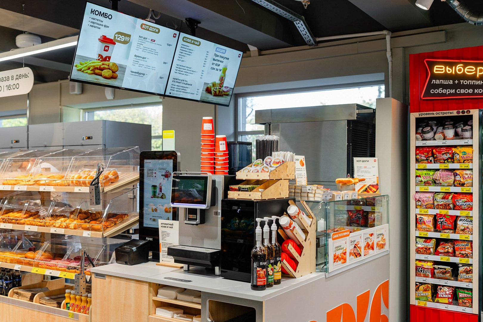 Помимо обновленного торгового зала, который мы постарались сделать понятным и без лишнего визуального «шума», в новом концепте заложены две миссии. Первая сфокусирована на закрытии потребности быстрого питания – это важный тренд. В этом случае у покупателя есть возможность пройти по магазину «короткую петлю», которую замыкает мини-кафе. Там представлен широкий ассортимент готовой еды – кулинария, фритюр, хот-доги, выпечка, рамен, напитки. Вторая крупная миссия – это полноценная покупка. В новом концепте представлены достаточно традиционные категории, которые также меняются под паттерны потребления в каждой локации.