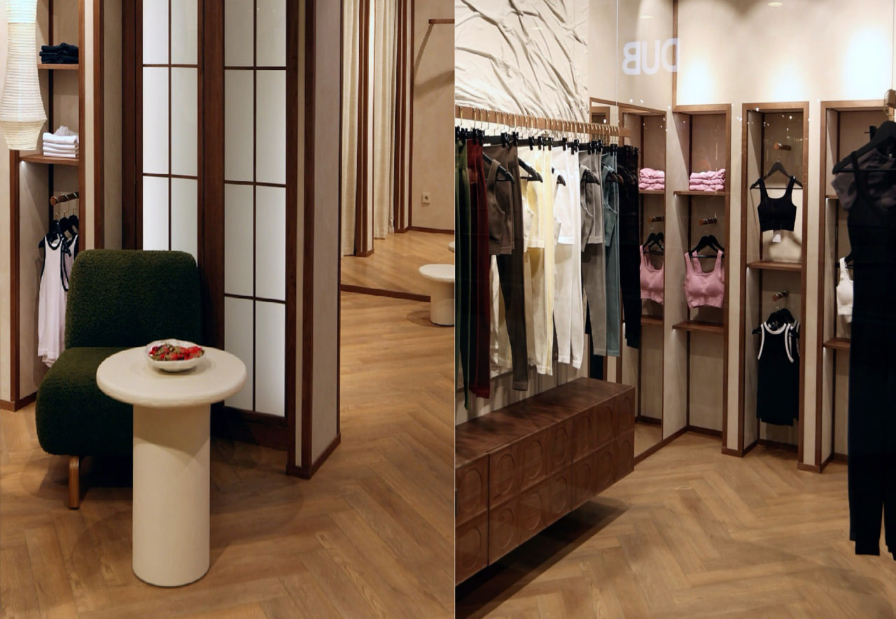 Концепт магазина выстроен вокруг ассоциаций с домом как зоной комфорта, восстановления и исцеления. Пространство наполняют теплые оттенки, деликатный рассеянный свет и природные текстуры, в частности, дерево разных пород. Акцентным элементом интерьера стало монохромное панно с лепниной, имитирующей драпировки ткани. Символическим смыслом наделено декоративное окно как продолжение темы дома, посредник между внутренним и внешним мирами.
