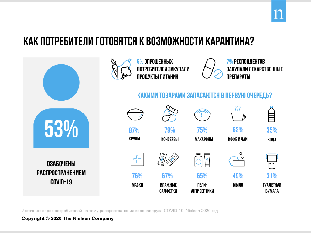 Данные ритейл-аудита в крупнейших розничных сетях России подтверждают и результаты опроса, проведенного Nielsen среди потребителей. Более половины (53%) респондентов признались, что «скорее озабочены» или «очень озабочены» распространением коронавируса. Пятая часть опрошенных (22%) сказали, что отменили путешествия за границу, столько же (22%) ограничили пользование общественным транспортом, а почти треть (32%) отказались от посещения общественных мероприятий.