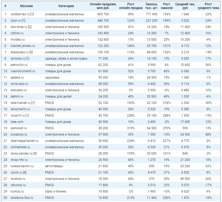Рейтинг интернет-магазинов включает данные по объему онлайн-продаж, количеству заказов и среднему чеку. Под онлайн-продажами понимаются заказы, размещенные через сайт или связанное с ним приложение (независимо от способа оплаты и доставки). Учитывались только заказы, сделанные покупателем со своего устройства (не учитываются заказы, сделанные через стационарные или портативные терминалы продавца). Учитывались только продажи российских продавцов (компаний и ИП) российским покупателям.