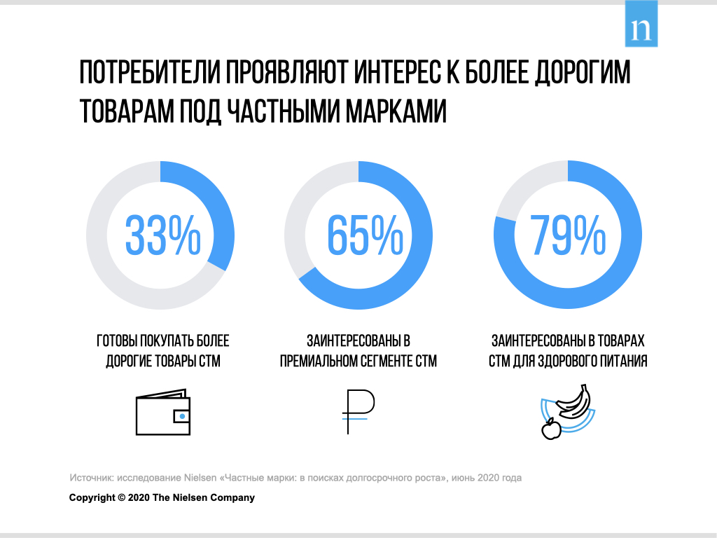 Несмотря на сокращение расходов, каждый третий (33%) покупатель СТМ, опрошенный Nielsen, проявляет интерес к более дорогим товарам под частными марками. В премиальном сегменте частных марок заинтересованы 65% опрошенных, в линейке продуктов для здорового питания — 79%.