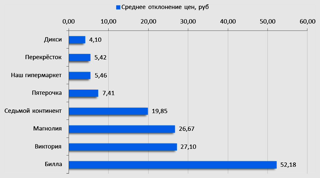 Примечание: Среднее отклонение цен показывает, на сколько рублей в среднем дешевле/дороже 1 позиция в представленной торговой сети по сравнению с другими сетями. Ранее аналогичный рейтинг был составлен по продуктовой категории «Кондитерские изделия».