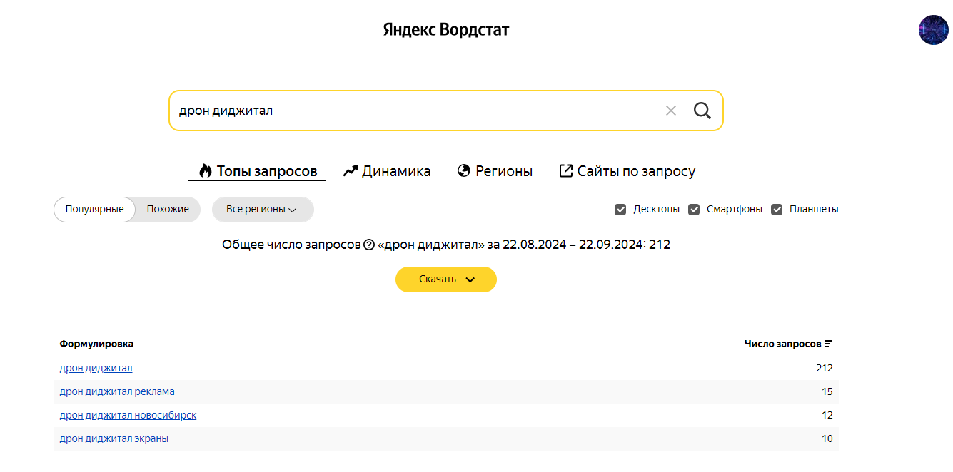 3. Динамика брендовых запросов. С помощью Яндекс Wordstat и Google Trends можно узнать, как часто вашу компанию или продукт ищут в интернете. Например, вот так выглядит частотность запросов для DRON.DIGITAL: