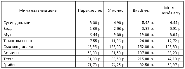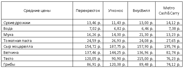 Закупать продукты для сравнения мы будем в четырех интернет-магазинах Москвы: Перекресток, Утконос, ВкусВилл, Metro Cash&Carry. Готовить пиццу будем в двух вариантах: с помощью готового теста и тесто готовим сами. Цены в интернет-магазинах будут представлены в средних и минимальных значениях.