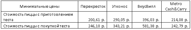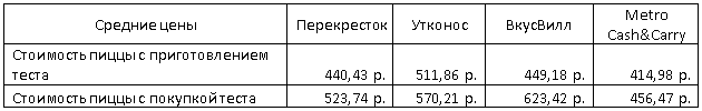 Таким образом, по средним ценам самую дешевую пиццу как с использованием готового теста, так и делая тесто собственными силами можно испечь, покупая продукты в интернет-магазине Metro Cash&Carry. Большая пиццы с ветчиной и грибами в Metro в среднем обойдется в 414,98 руб с приготовлением теста и 456,47 руб с покупкой готового теста.