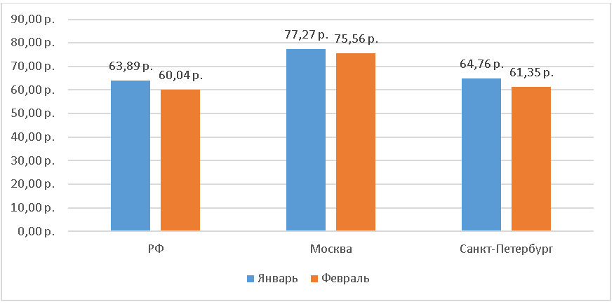 Молочка. Молоко стерилизованное и пастеризованное подорожало на 1-3% по сравнению с началом года. Пастеризованное молоко в феврале стоило 70,98 руб/л в Санкт-Петербурге, 76,87 руб/л в Москве и 58,59 руб/л в РФ. Стоимость сметаны, творога, творожных сырков, сливочного масла, плавленого сыра, брынзы, кисломолочных продуктов значительно не изменилась. Сыр подорожал в Санкт-Петербурге: за месяц цена прибавила 13 рублей, в феврале килограмм сыра можно было купить за 563,07 руб. в Москве сыр на 25% дороже – 748,75 руб.
