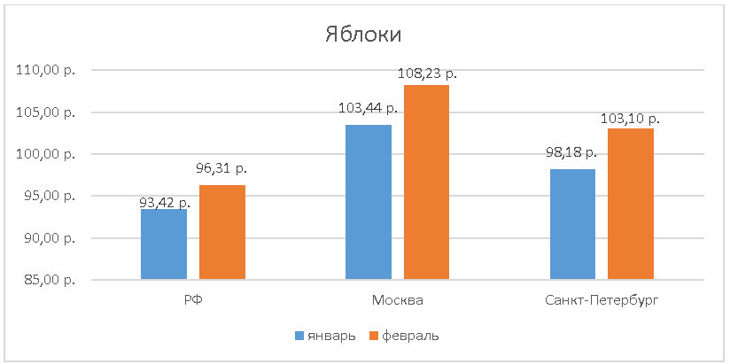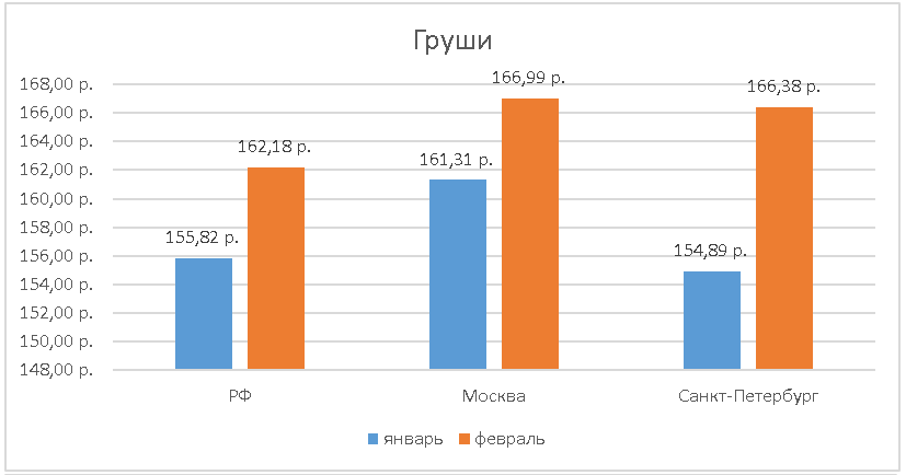 Увеличение цены на 3-5% заметно и на яблоки. В прошлом месяце яблоки в среднем стоили 108,23 руб в Москве и 103,1 руб в Санкт-Петербурге. Подорожали также груши на 4-7%: в Москве в феврале они стоили 166,99 руб, в Питере – 166,38 руб, в России – 162,18 руб.