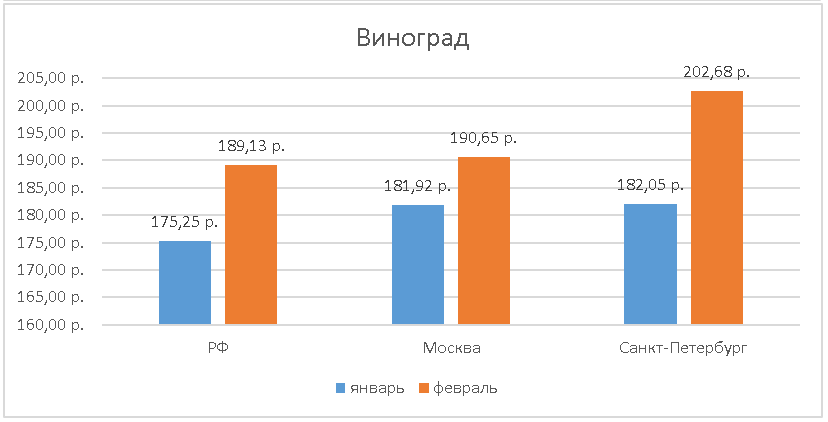 Также в феврале подорожал виноград: его стоимость увеличилась на 10-20 руб в зависимости от региона. В Москве в феврале килограмм винограда в среднем стоил 190,65 руб, в Питере – 202,68 руб, по России в целом – 189,13 руб.