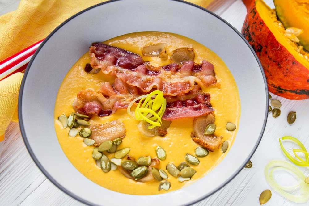 Тыквенный крем-суп. Его очень легко приготовить, ведь понадобятся только тыква, сливки и блендер. Существует бесконечное множество рецептов тыквенного супа, и можно найти и определить для себя свой любимый. В добавление к супу идут тыквенные семечки, жареный бекон, гренки или тертый сыр.