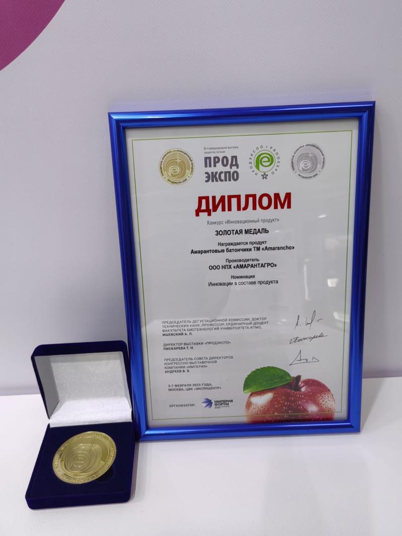 Батончики Amarancho из амаранта-суперфуда производятся по инновационным рецептурам в партнерстве НПХ «АмарантАгро» с компанией «Арида». На «Продэкспо-2025» им присуждена золотая медаль в номинации «Инновации в составе продукта».