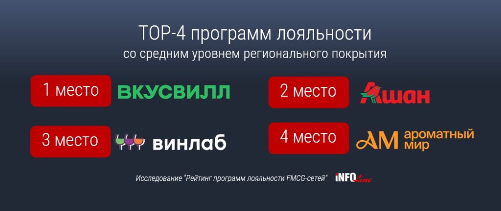 В 2025 году эксперты INFOLine отметили ротацию в рейтинге среднего уровня: программа «Ашана» вышла на второе место, сместив с этой позиции сеть «ВинЛаб». В Top-4 по итогам 9 месяцев вошли программа «ВкусВилл», «Карта Ашан», Winclub сети «ВинЛаб» и «Винная карта» от «Ароматного мира».