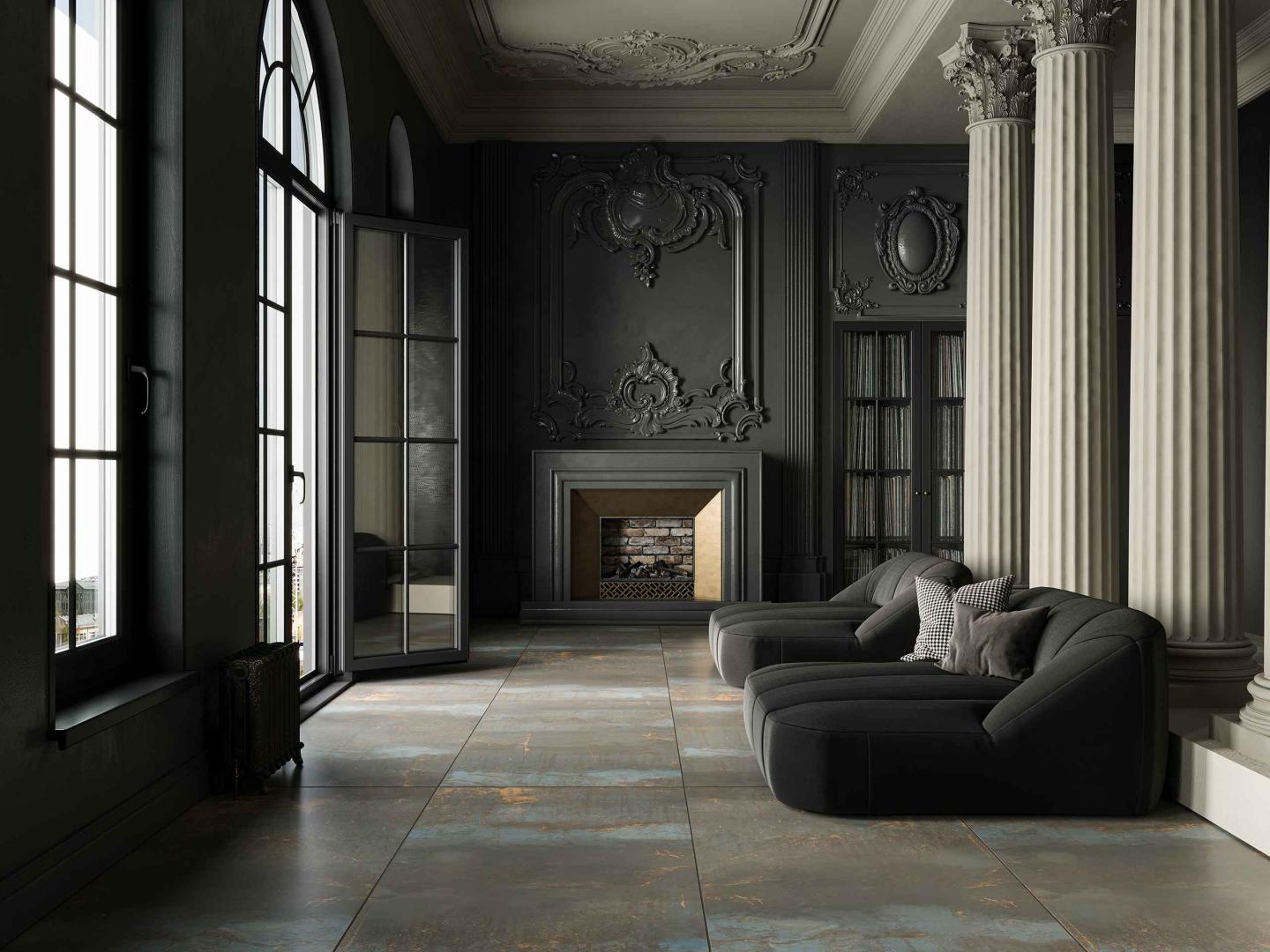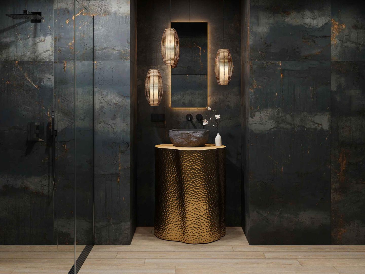 Новая коллекция Patina — это поэма времени, запечатленная в текстуре и цвете. Каждая плитка мастерски передает богатство оттенков окисленного металла — от теплых охристых тонов меди до холодных переливов бронзы с зелеными и голубыми акцентами. Эти насыщенные и живые поверхности создают ощущение глубины, эмоциональности и индивидуального характера. Коллекция представлена в двух выразительных цветах: голубовато-сером с рыжими прожилками и антрацитовом с яркими всполохами меди.