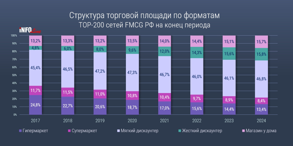 Чистый прирост торговых площадей (с учетом закрытых точек) сократился год к году на 7,7%. В 2023-м динамика также была отрицательной, но менее выраженной – тогда показатель упал на 2,5%. Снижение темпов открытия новых площадей эксперты INFOLine связывают с подорожанием заемных средств, ужесточающимся дефицитом персонала на рынке и усилением конкуренции за локации.