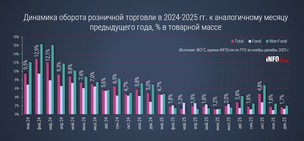 В течение года на потребительскую активность влияли осложняющаяся ситуация в экономике и на рынке труда, продажи ряда категорий сокращались. Эксперты INFOLine считали, что динамика РТО итогам 2025-го в физическом выражении замедлится на 5,4 п.п. до 2,3% год к году. Рост розничного товарооборота в сегменте продуктов питания, по их оценкам, составит 2,1%, непродовольственные категории прибавят 2,5%.