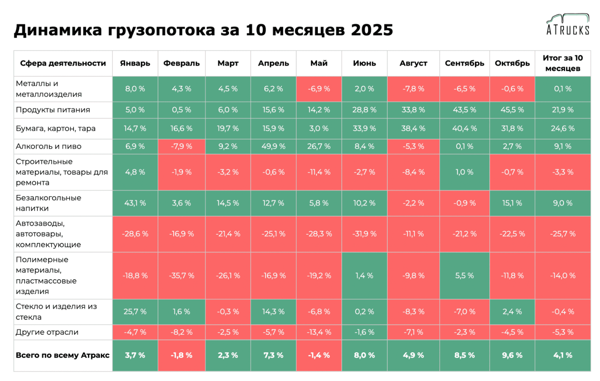 Логистическая площадка «Атракс» подвела итоги десяти месяцев 2025 года. Октябрь стал месяцем уверенного роста общего грузопотока. Прирост составил +9,6% по сравнению с октябрем прошлого года. Данные свидетельствовали о сезонном оживлении в логистике, которое, однако, затронуло разные отрасли неравномерно.