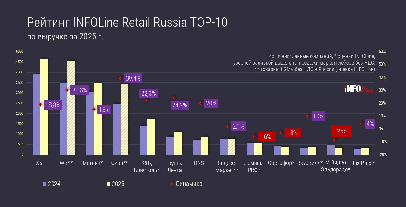 Продажи десяти крупнейших ритейлеров без учета маркетплейсов в 2025 году выросли на 13% до 13,63 трлн руб., а их доля в розничном товарообороте страны – на 0,8 п.п. до 31,1%, сообщили авторы отраслевого обзора INFOLine «Розничная торговля Non-Food и потребительский рынок России». Вместе с маркетплейсами показатель увеличился на 19,7% до 22,22 трлн руб., а доля в РТО прибавила 3,8 п.п. до 49,2%.