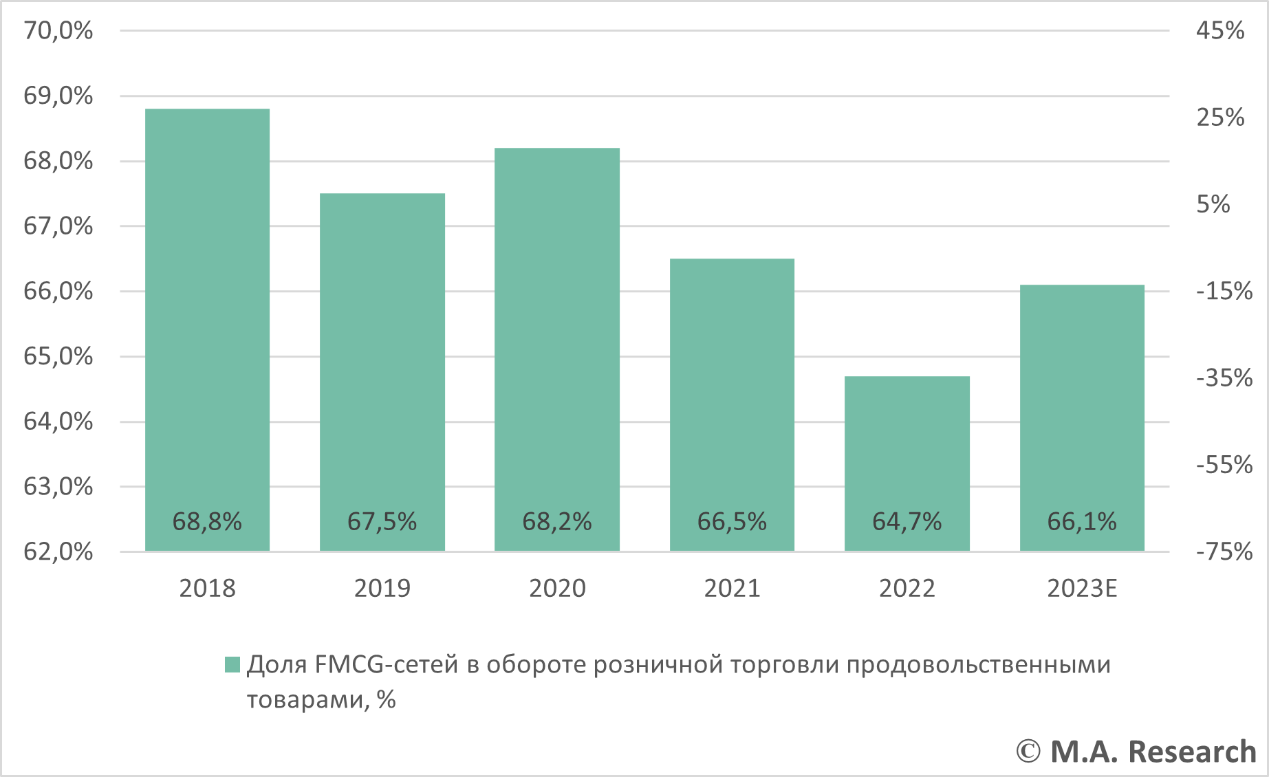 По данным исследования M.A.Research "Российский ритейл в 2021-2022 гг. и прогноз на 2023-2026 гг.", в 2022 г. оборот сетевой продовольственной розницы вырос на 10,2%, до 13,6 трлн рублей, включая показатели онлайн-продаж, драйверами остались крупные федеральные и в меньшей степени крупные региональные сети. Доля FMCG-сетей в обороте продовольственного ритейла в 2022 г. составила 64,7%, снизившись на 1,8 п.п. по сравнению с 2021 г., по оценке M.A.Research. Снижение доли продовольственных торговых сетей в обороте розничной торговли обусловлено растущей конкуренцией со стороны онлайн-торговли, в частности маркетплейсов и сервисов доставки, ставших драйверами рынка e-grocery в прошлом году.