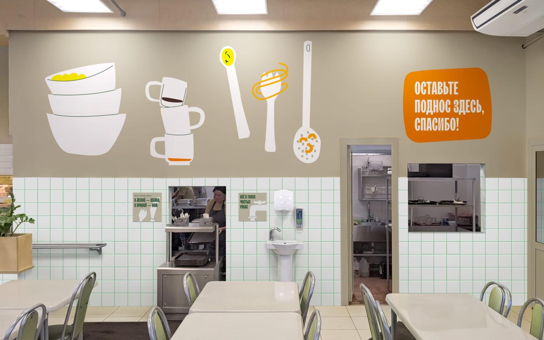 Отличительную деталь интерьера столовых – плитку - использовали как стильный акцент не только в графике, но и обыграли яркими краской (цветной затиркой) в интерьере. В дополнение отрисовали иллюстрации, которые оживляют бежевый фон и добавляют динамики на фирменные носители.
