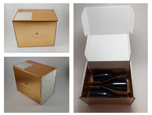 Транспортная упаковка (гофрокороб со вставками) для игристого вина ограниченной серии предназначена для безопасной транспортировки бутылок в горизонтальном положении. Уникальные вкладыши сложной формы обеспечивают надежность и защищают этикетки, мюзле и капсулы от повреждений. Металлизированный картон с печатью подчеркивает премиальность упакованного продукта.
