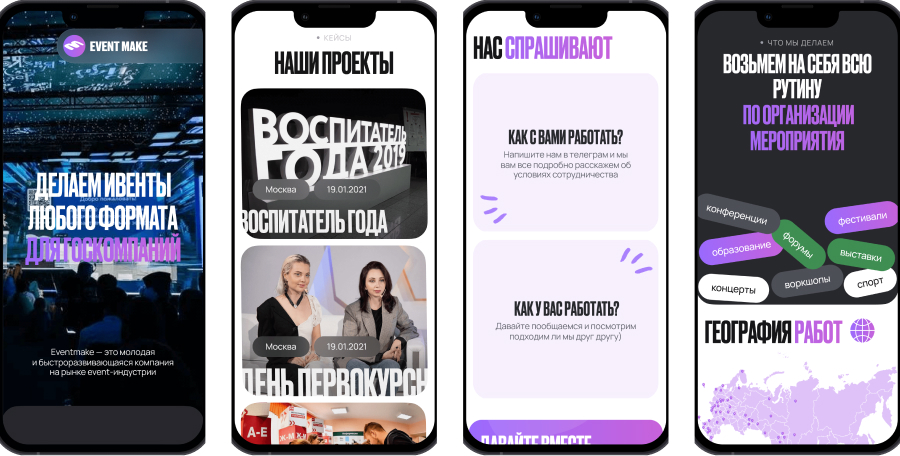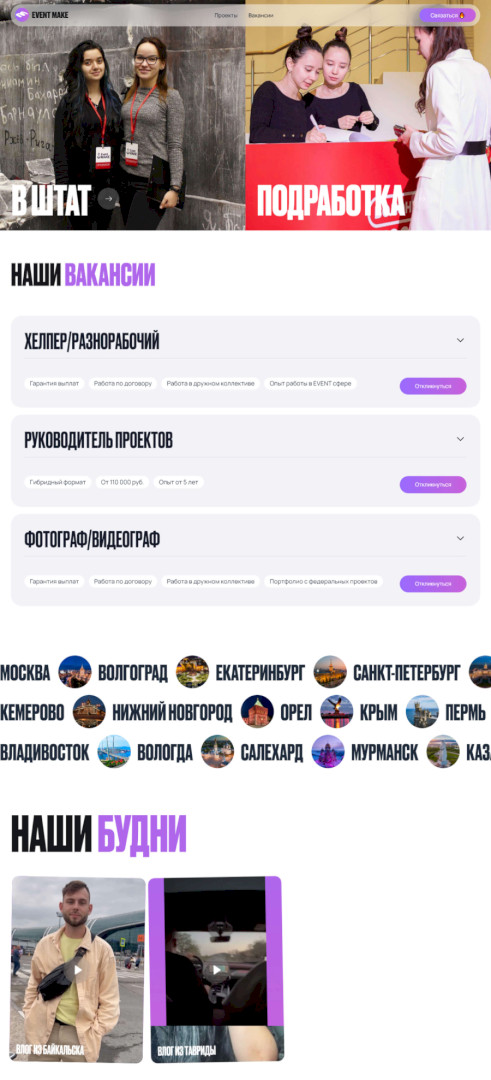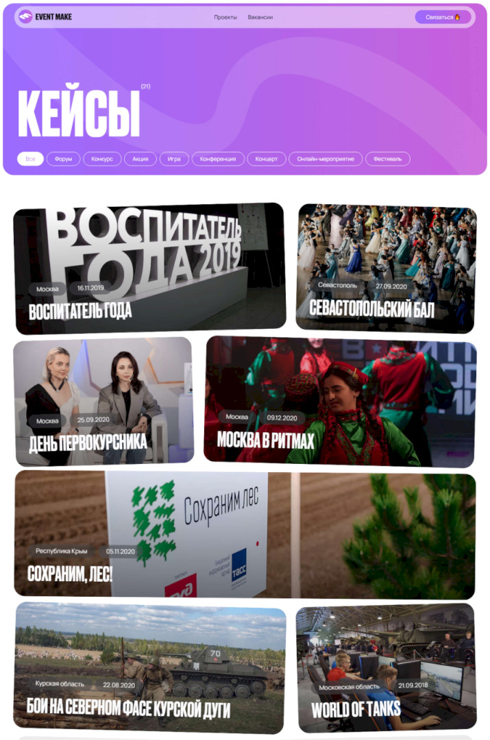 - Анимированный список кейсов в формате: фото анонс; название мероприятия; город; дата.