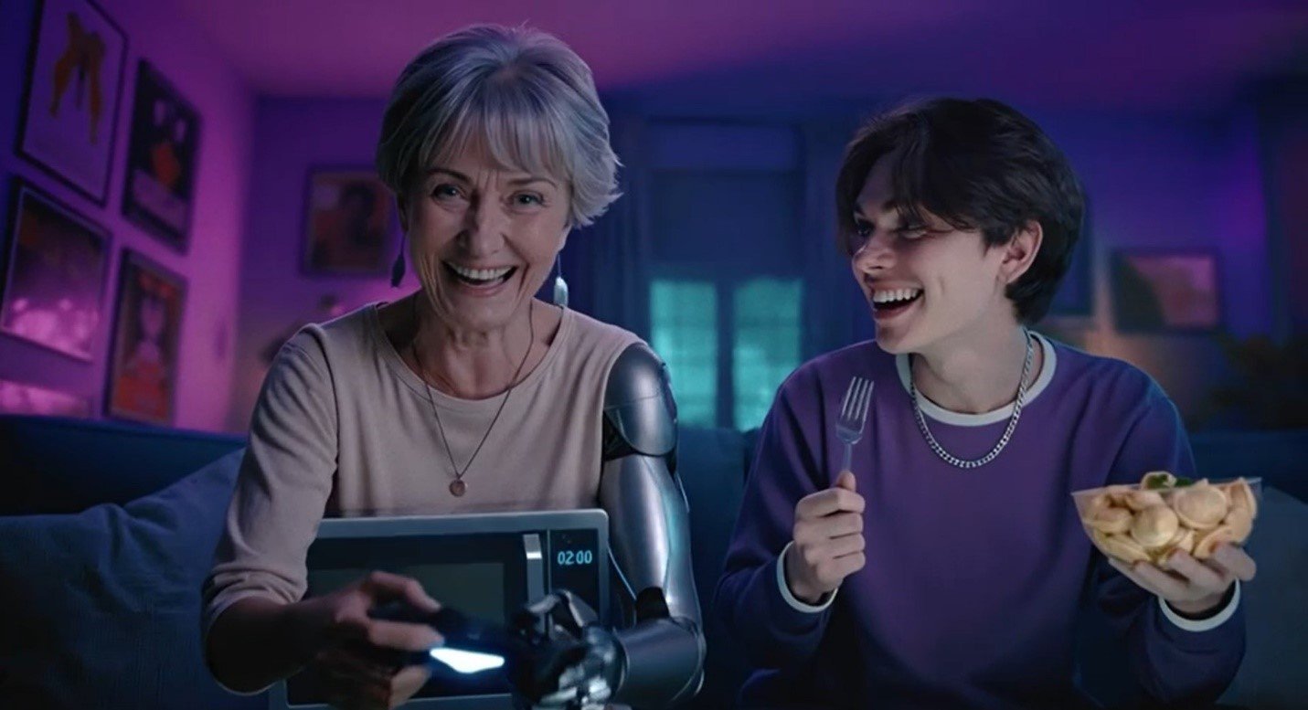 В центре концепции — «бабушка-микроволновка», которая стала не просто героиней ролика, а настоящим мемом. Она живет в мире киберпанка с элементами высоких технологий. В ролике нет ни одного отснятого кадра: локации и герои созданы при помощи ИИ. Применение инновационной технологии позволило передать основную идею продукта. А создание сотни вариантов бабушек и внуков, костюмов и локаций позволило выбрать для ролика эффектные и цепляющие внимание образы и детали.