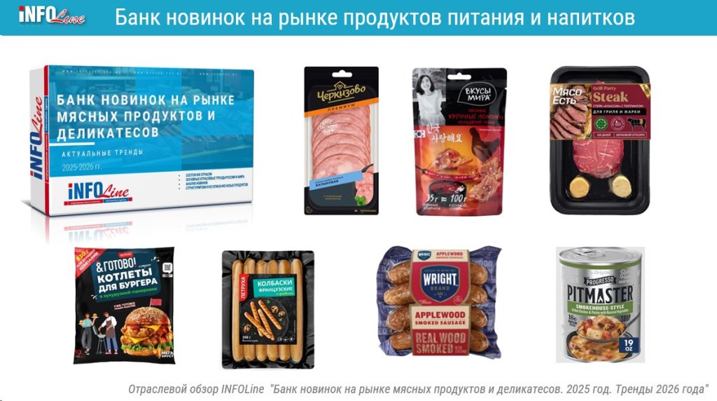 Информационно-аналитическое агентство INFOLine завершило подготовку масштабного обзора «Банк новинок на рынке мясных продуктов и деликатесов. 2025 год. Тренды 2026 года». Обзор содержит систематизированную базу данных и аналитику по новым продуктам, выпущенным на российский и зарубежные рынки в 2025 году, и предназначен для профессионалов отрасли — производителей, ритейлеров, маркетологов и стратегов.