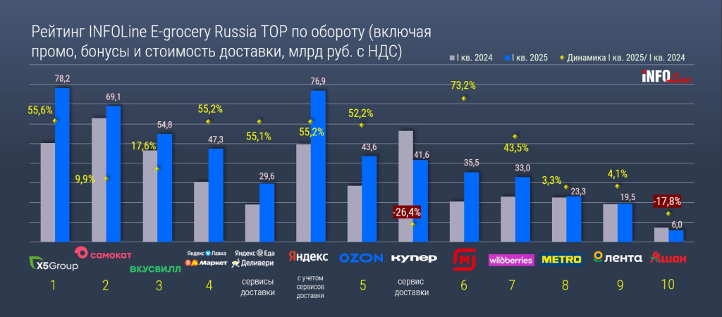 Стремительное падение продаж эксперты INFOLine зафиксировали у «Купера», его оборот за отчетный период сократился на 26,4% до 41,6 млрд руб., а по сравнению с IV кварталом 2024 г. – на 17,7%. Снижение связанно со стратегической трансформацией сервиса: он сместил фокус на повышение эффективности, улучшение юнит-экономики и развитие новых форматов взаимодействия с клиентами.