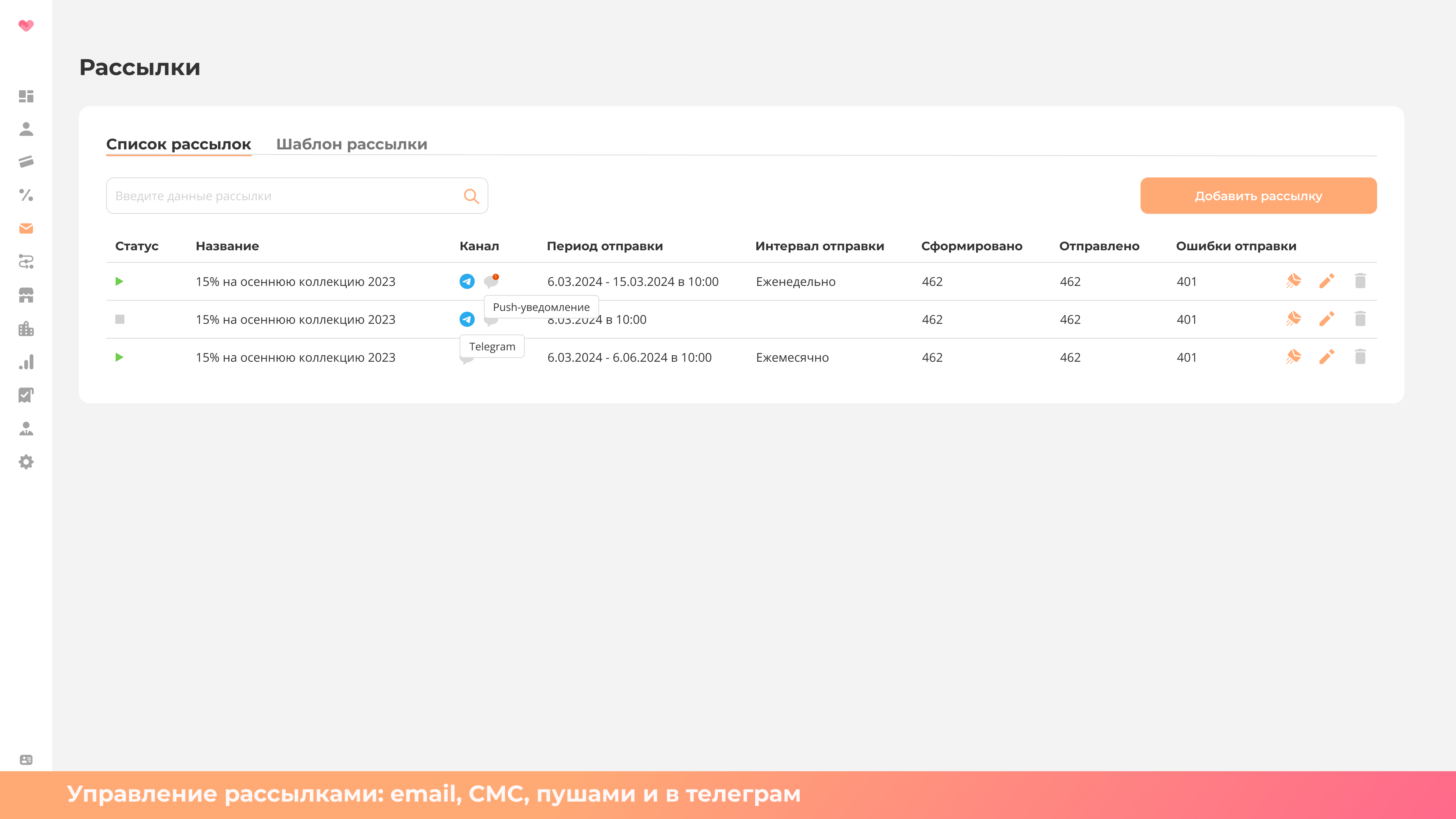 Рассылки и чат-боты в Telegram и VK. Помогает управлять рекламными и сервисными email-, СМС- и push-рассылками. С помощью чат-ботов можно регистрировать новых участников программы, рассказывать им об акциях и новинках.