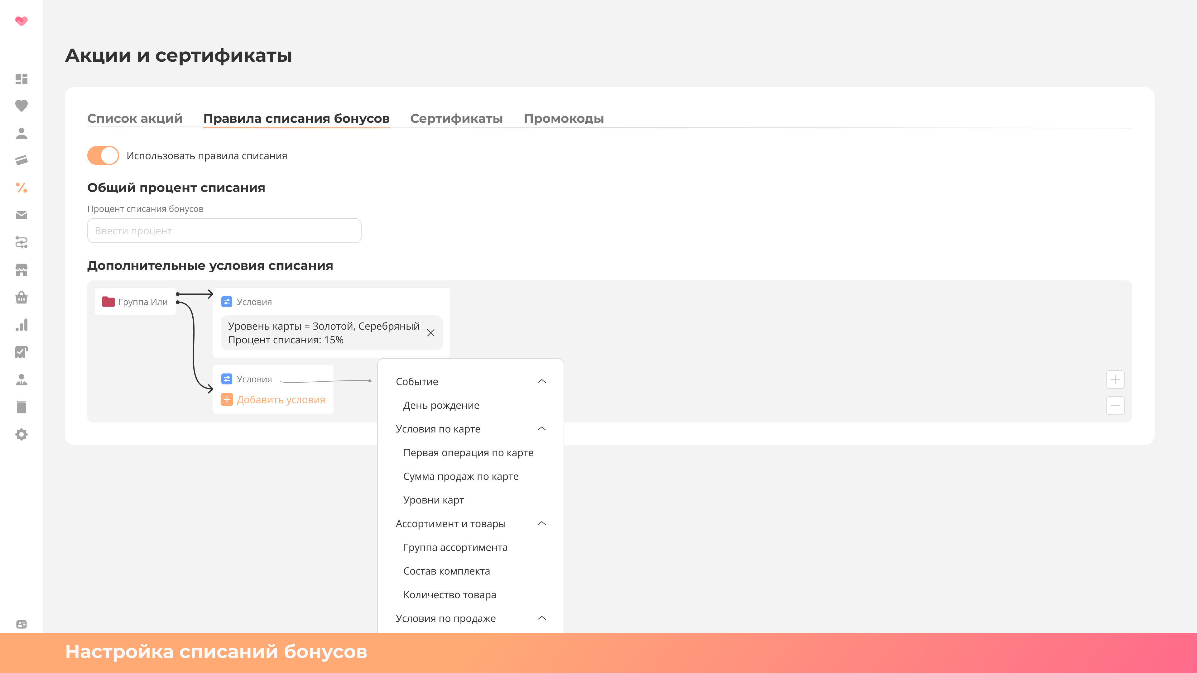 Программа лояльности. Помогает управлять программами лояльности любой сложности: дисконтной, бонусной, комбинированной и реферальной. Запускать акции, управлять промокодами, работать с подарочными сертификатами и абонементами на товары.