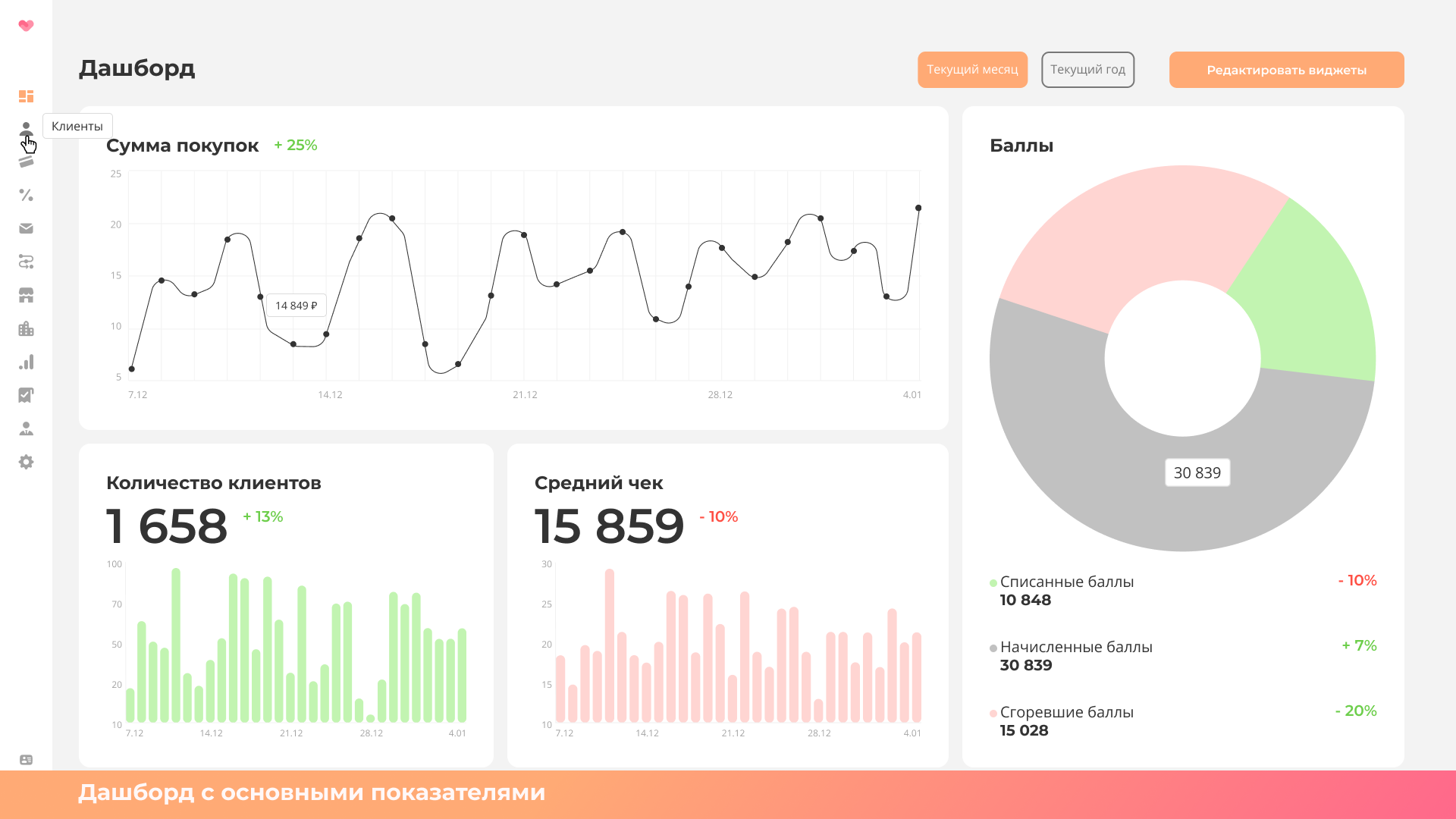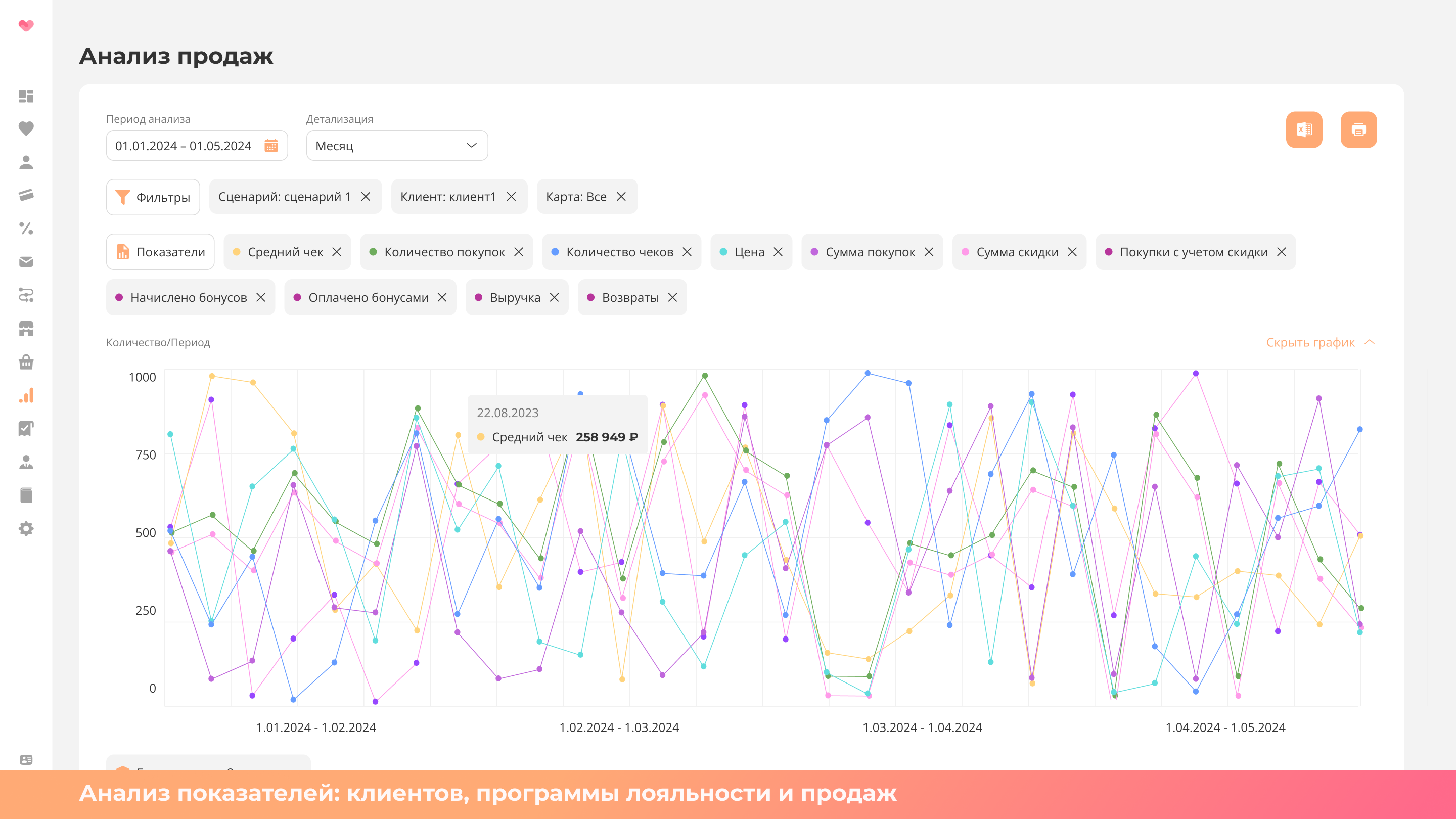 Аналитика. Формирует отчеты по программе лояльности, клиентам, ассортименту и продажам. Есть готовые отчеты или можно настроить собственные.